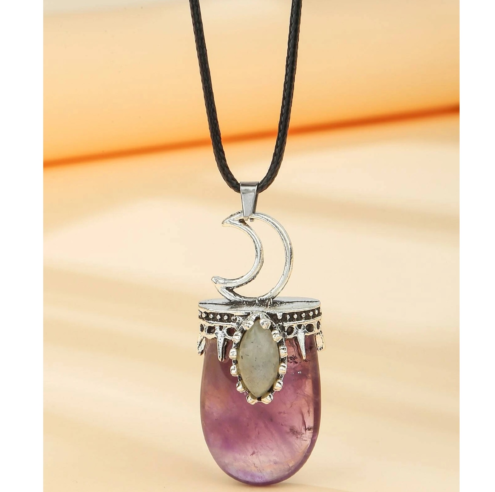 Πανέμορφο ασημί μενταγιόν με οβάλ αμέθυστο, μικρή πέτρα περίδοτο και διάτρητη ασημί ημισέληνο στο επάνω μέρος.
