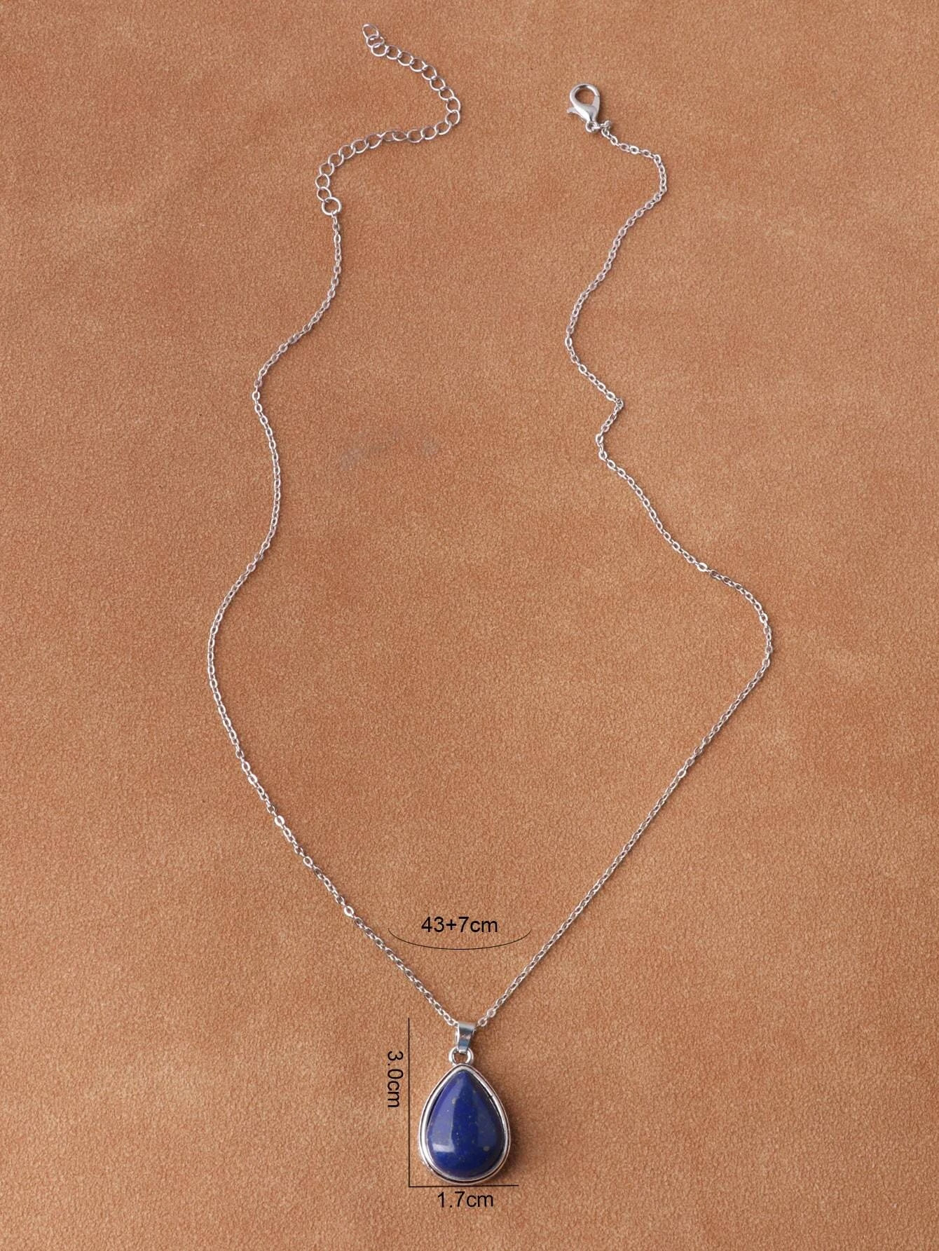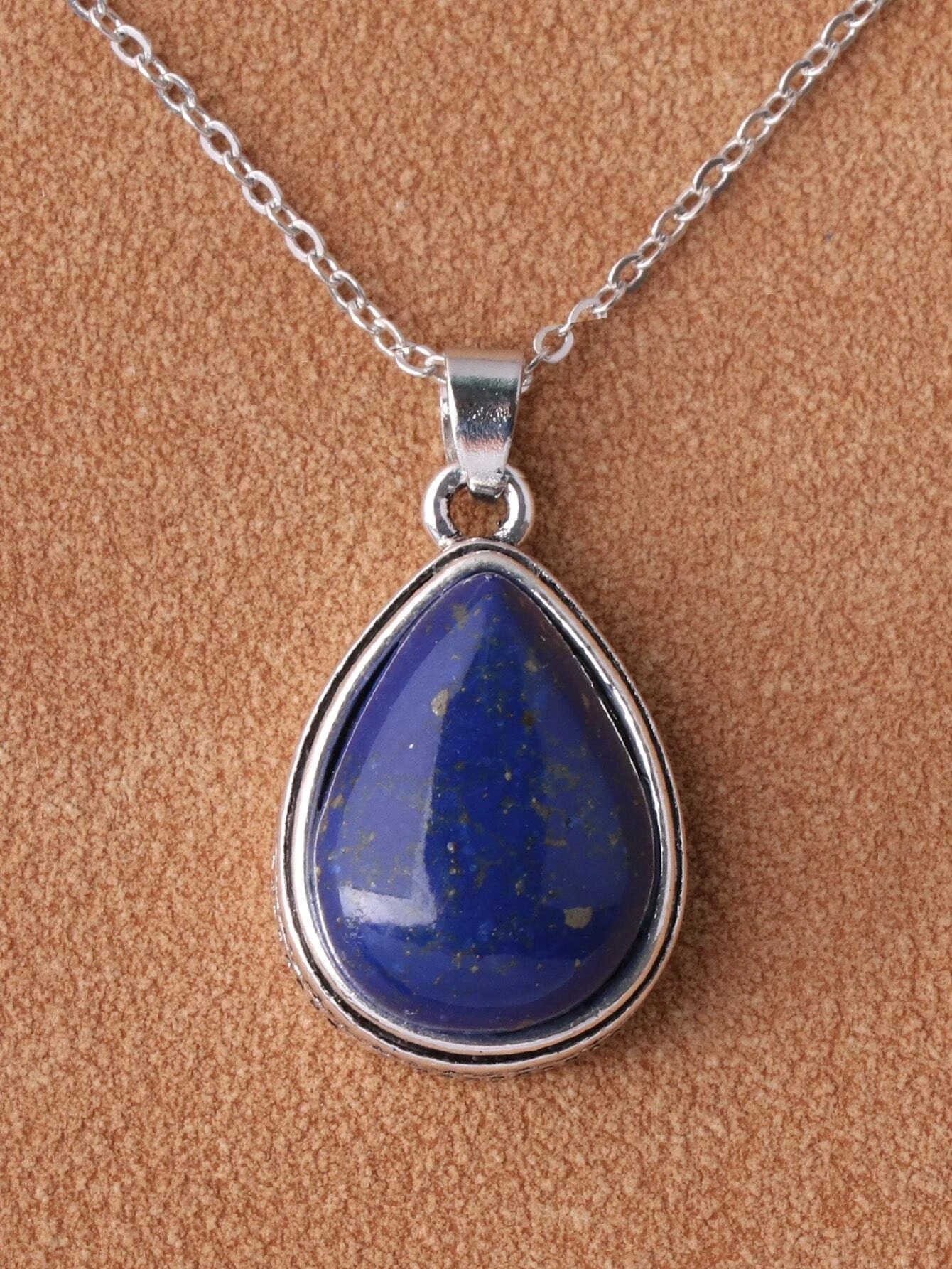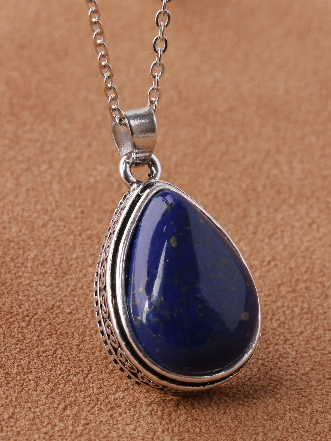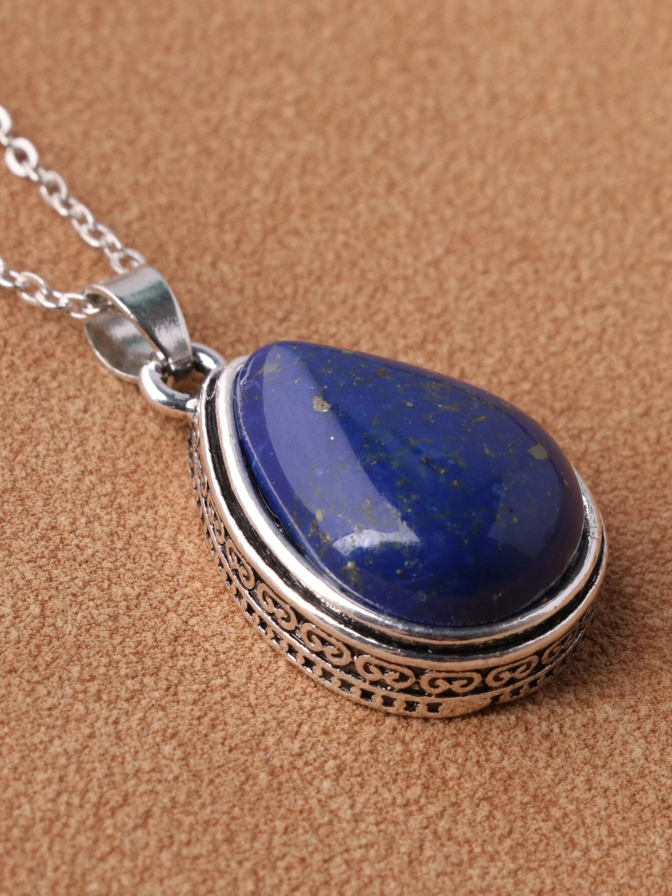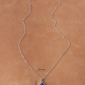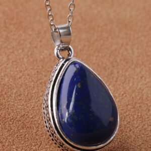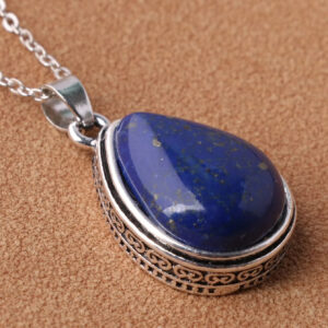 Ασημί αλυσίδα με μικρό σκαλιστό μενταγιόν σε σχήμα σταγόνας και μπλε lapis lazuli στο εσωτερικό του.