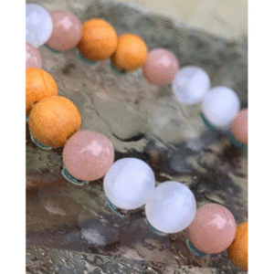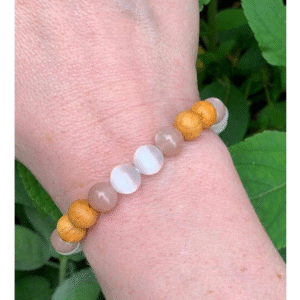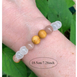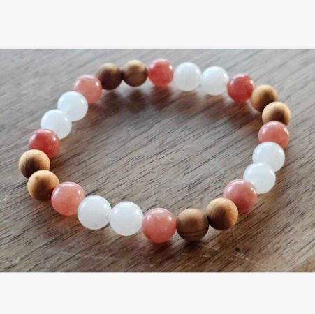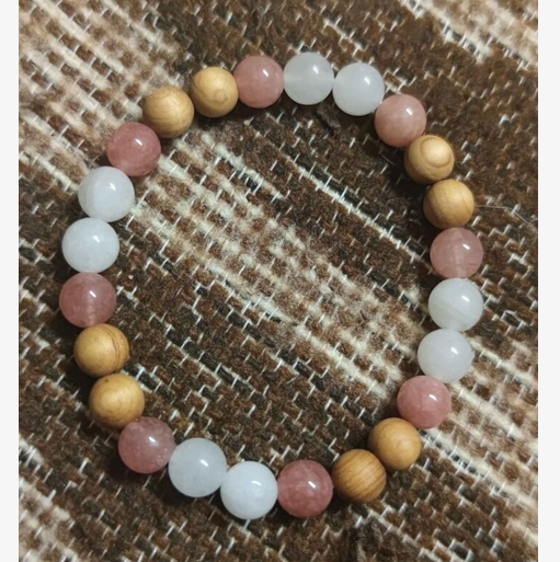 Ελαστικό βραχιόλι με χάντρες σελενίτη, ροζ χαλαζίας και ξύλου palo santo, για προστασία, ηρεμία και ενεργειακό καθαρισμό.