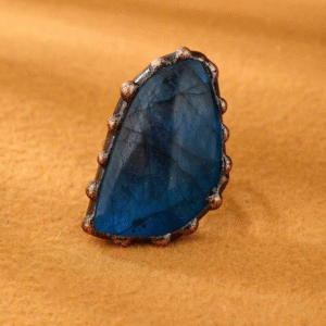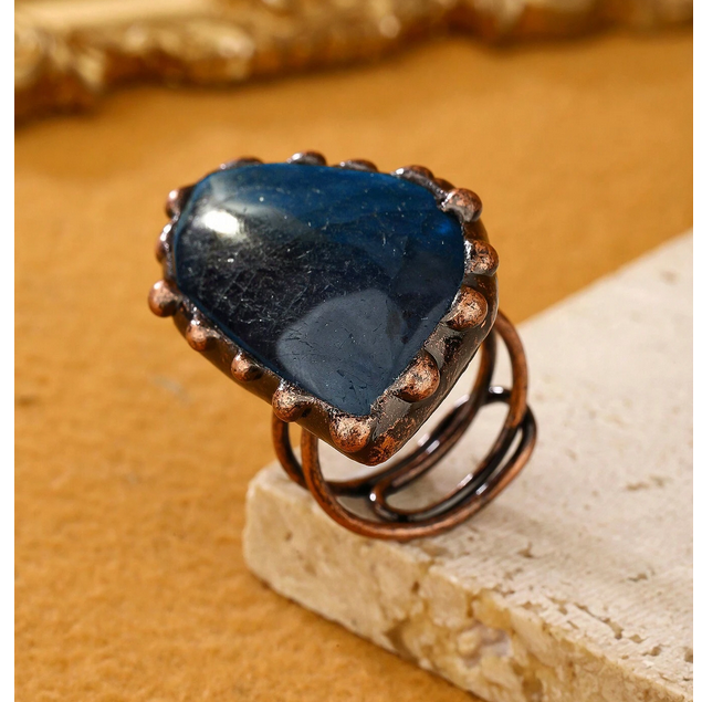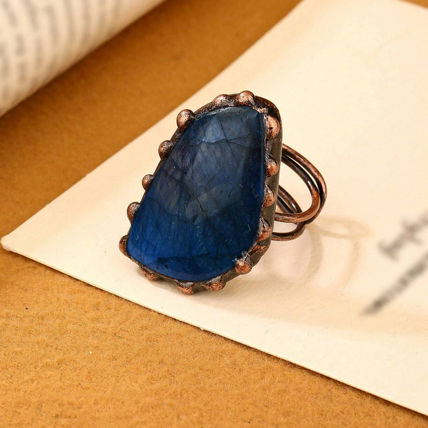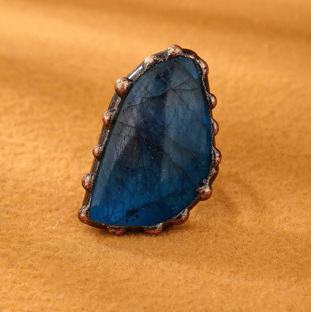 Ιδιαίτερο χειροποίητο χάλκινο δαχτυλίδι με μεγάλο κομμάτι μπλε λαβραδορίτη.