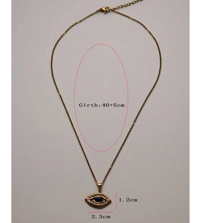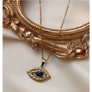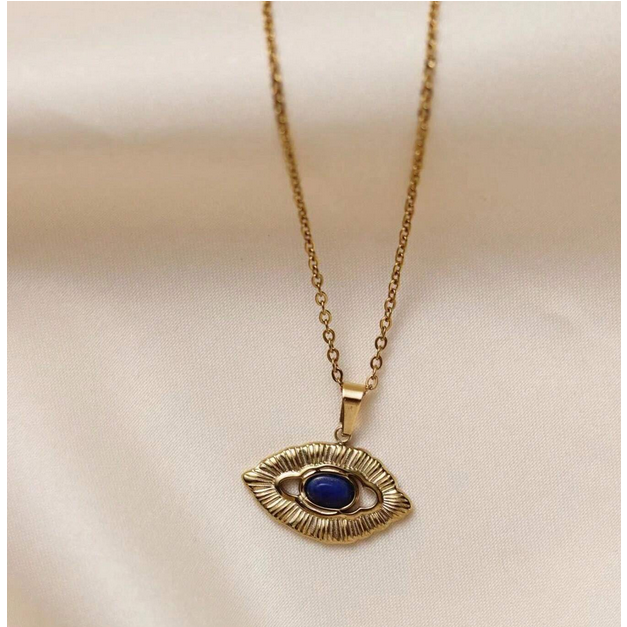 Χρυσό ατσάλινο κολιέ με αλυσίδα και μενταγιόν μάτι με μπλε lapis lazuli στο κέντρο του.
