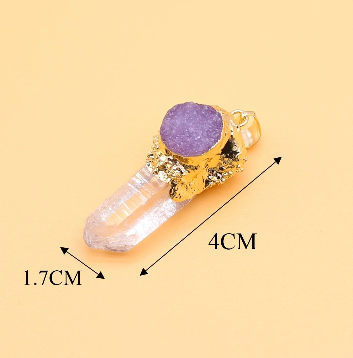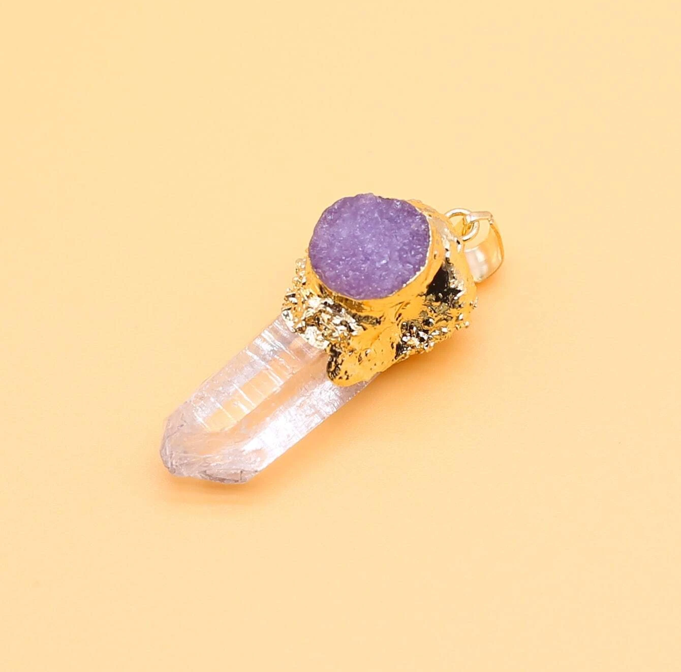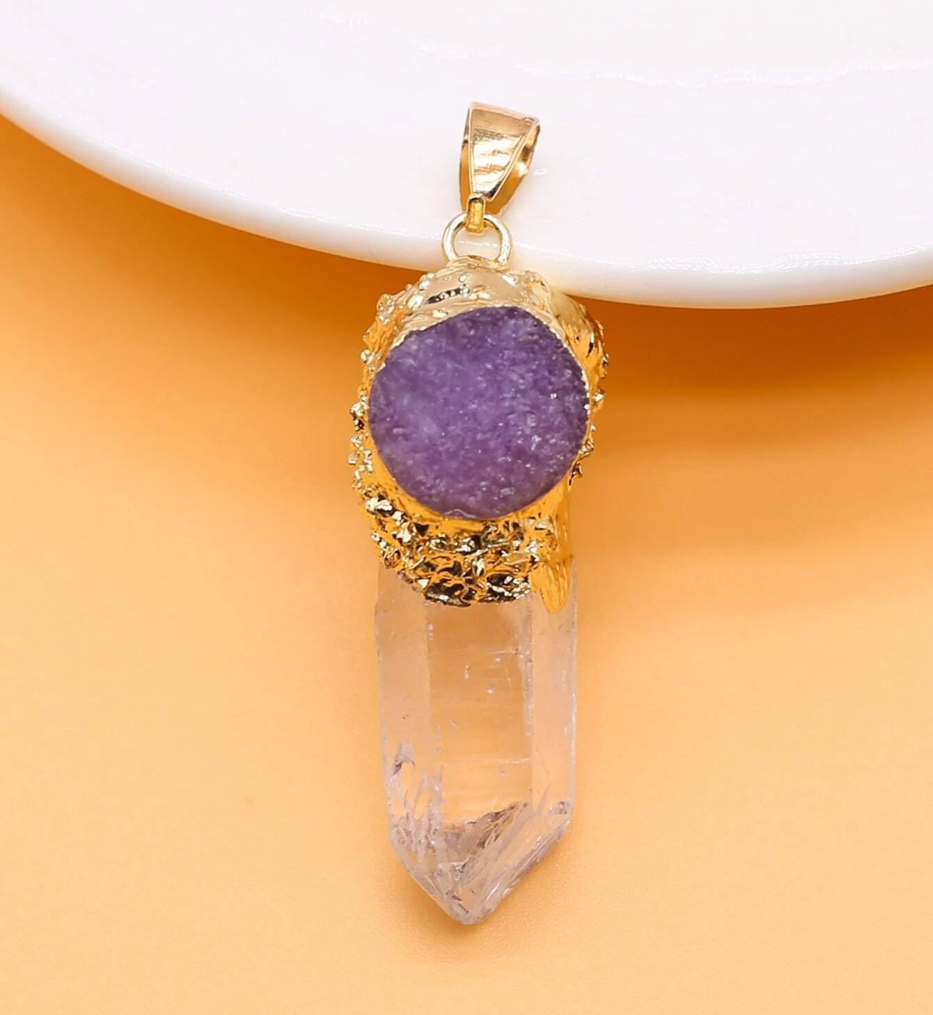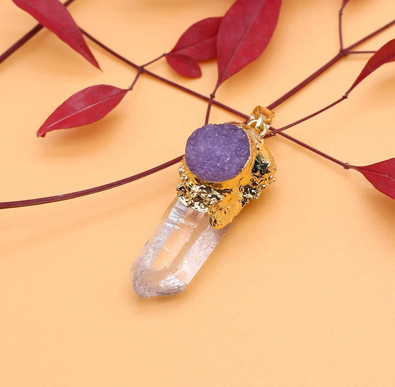 Πανέμορφο χρυσό μενταγιόν με ακατέργαστη αιχμή χαλαζία και druzy αμέθυστου.